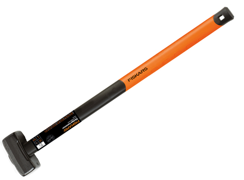 Fiskars sledgehammer L with forged carbon steel head and handle with fiberglass core and non-slip anti-vibration elastomer handle.