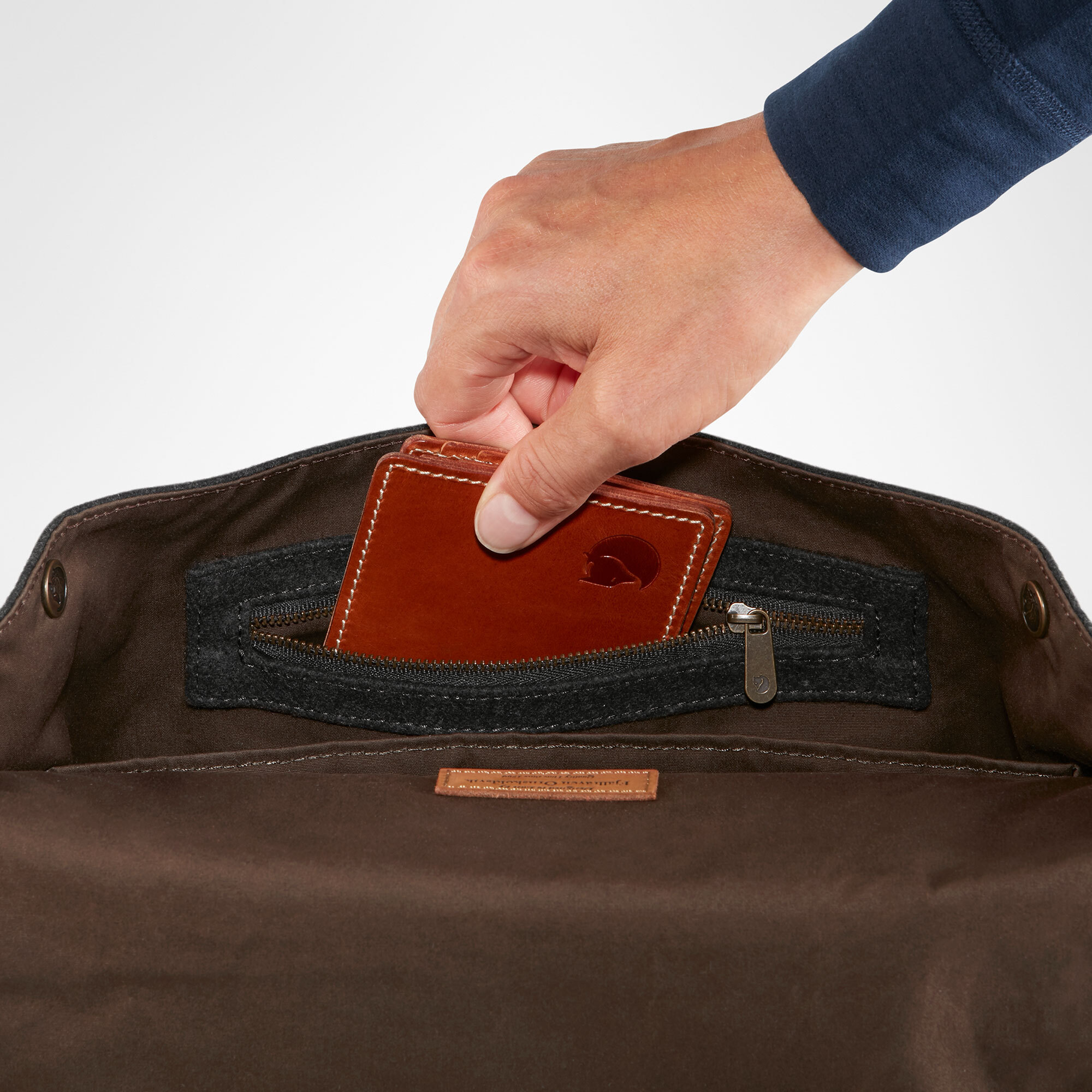 The fold-down lid is held in place with a leather strap and the shoulder straps are lightly padded. Inside there is a laptop compartment and an open compartment for notebooks, etc. The Norrvage Backpack is made from recycled wool.