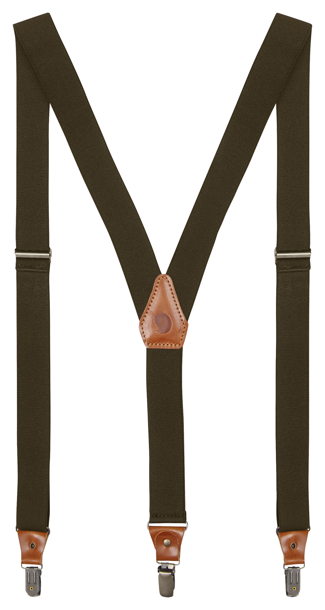 Adjustable suspenders made of sturdy stretch bands with details in vegetable tanned leather. Fjaellraeven Singi Clip Suspenders comfortably adjust to the movements of the body. Stamped logo on the leather detail on the back. Attach to pants with metal clips.