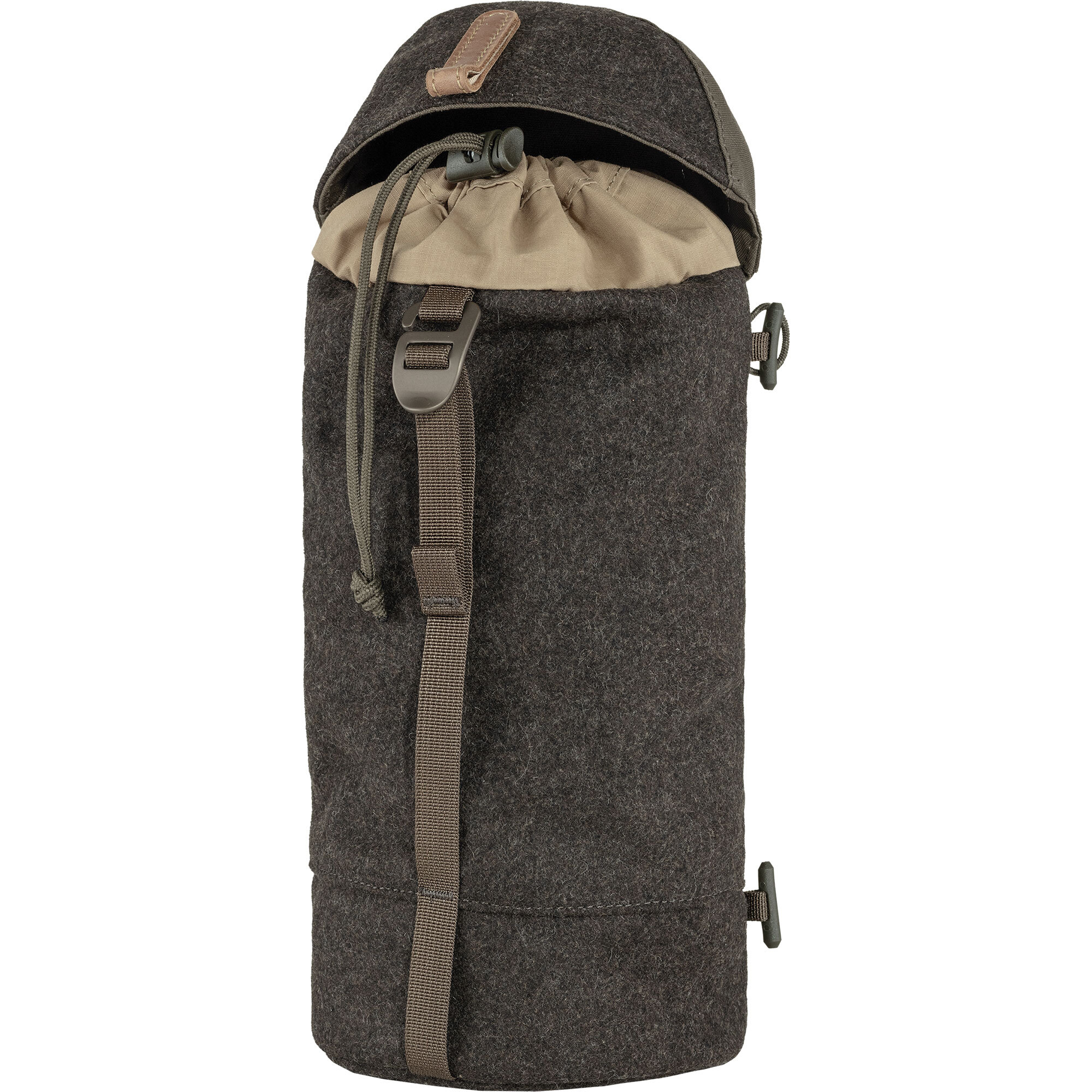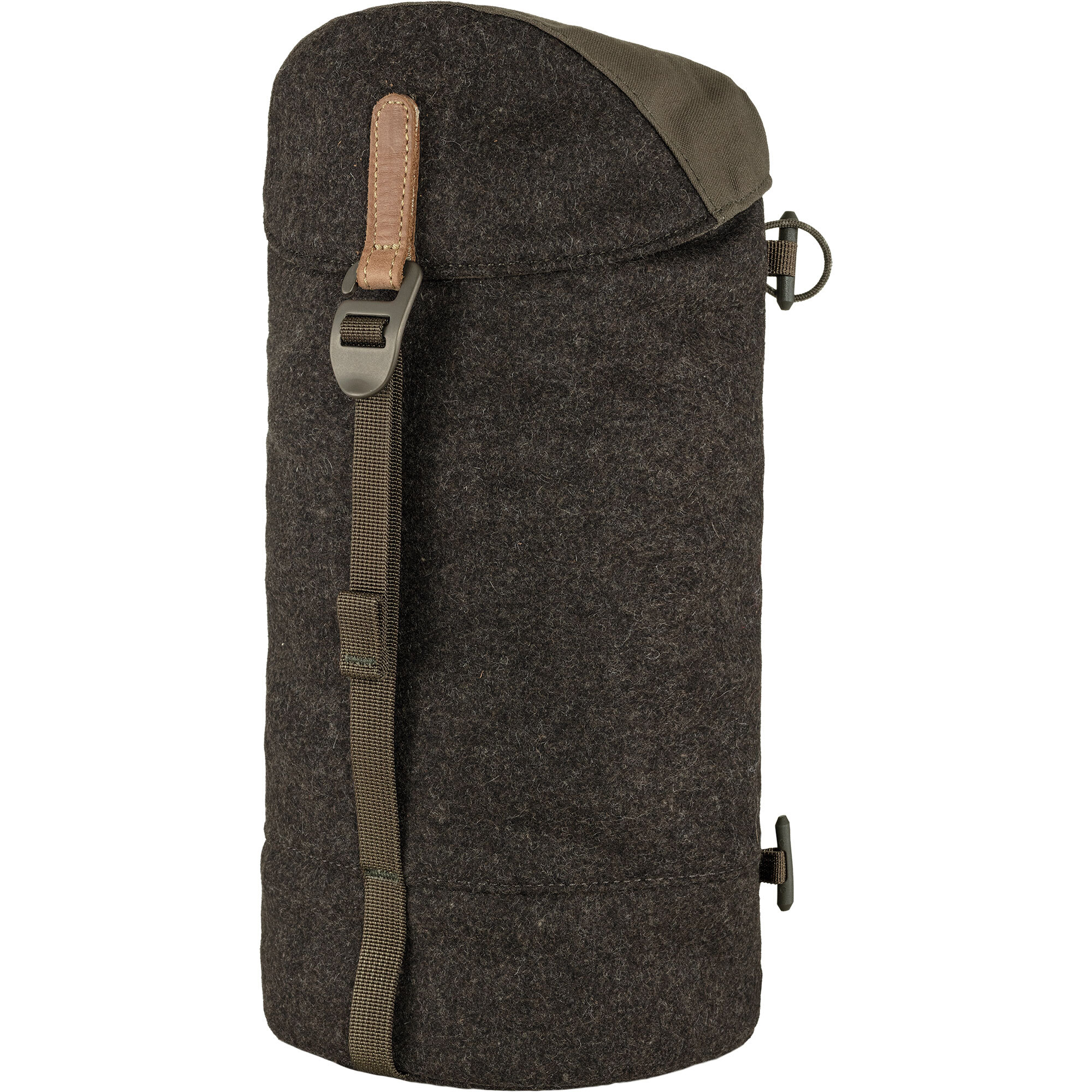 This side bag from Fjaellraeven made of durable, low-noise recycled wool and durable G-1000 HeavyDuty Eco takes advantage of the rugged and water-repellent wool. It also has a padded bottom that provides extra protection for the contents and also protects against noise when placed on the ground. Easy to attach to the side of the backpack.