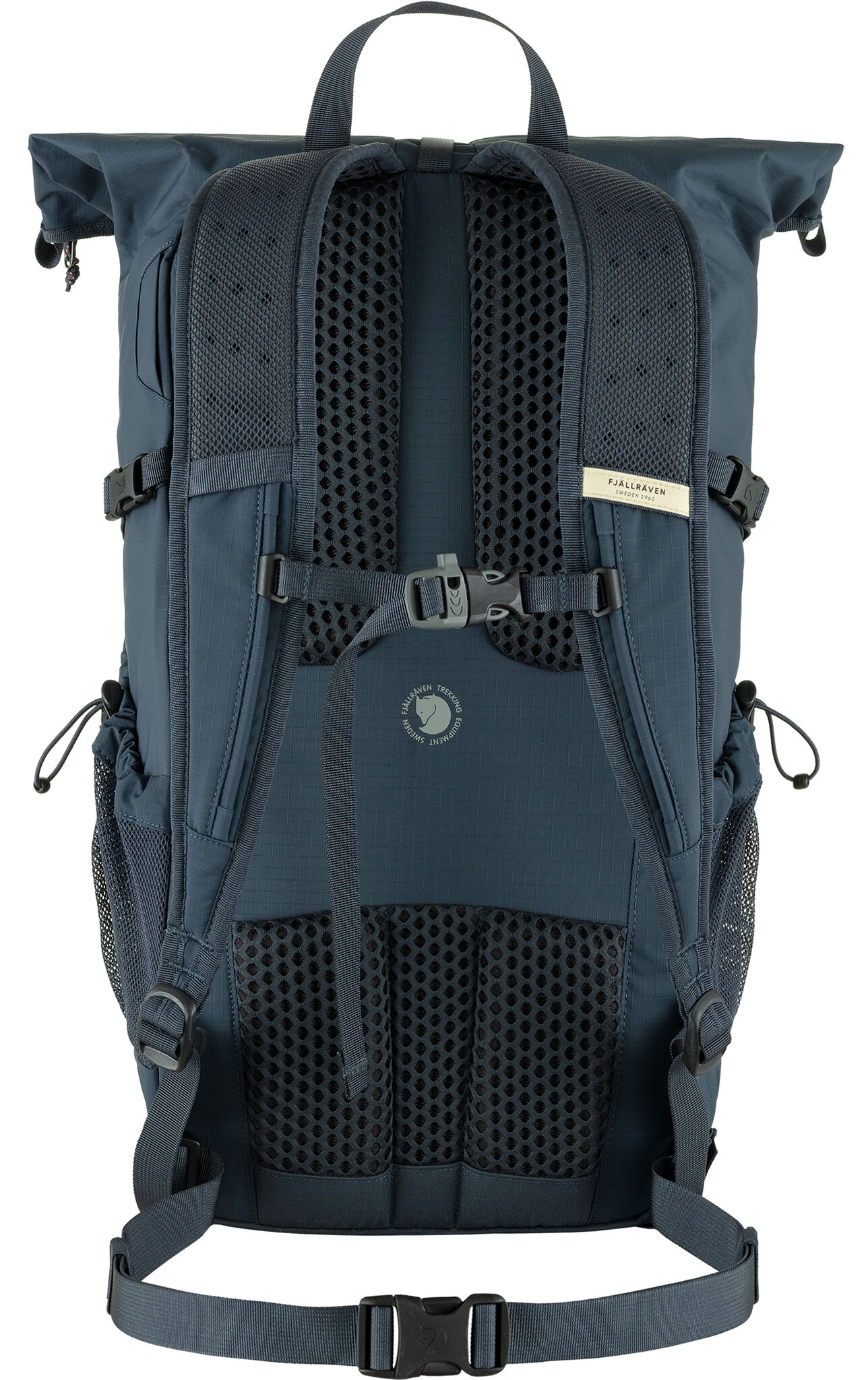 Roll-top lid compartment with zipper and plastic Quick Release Buckle.