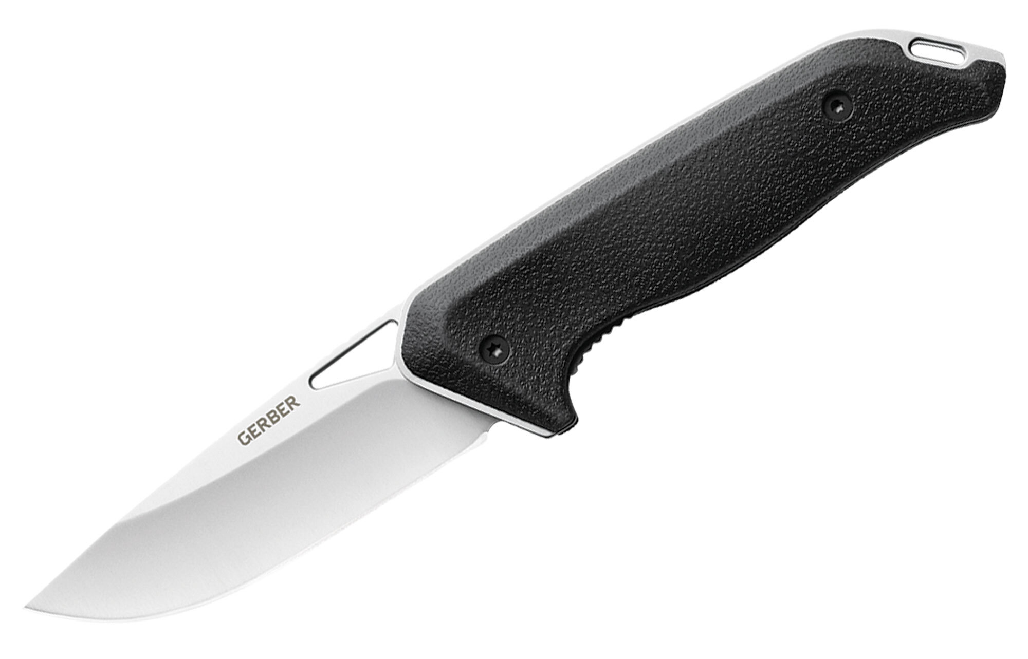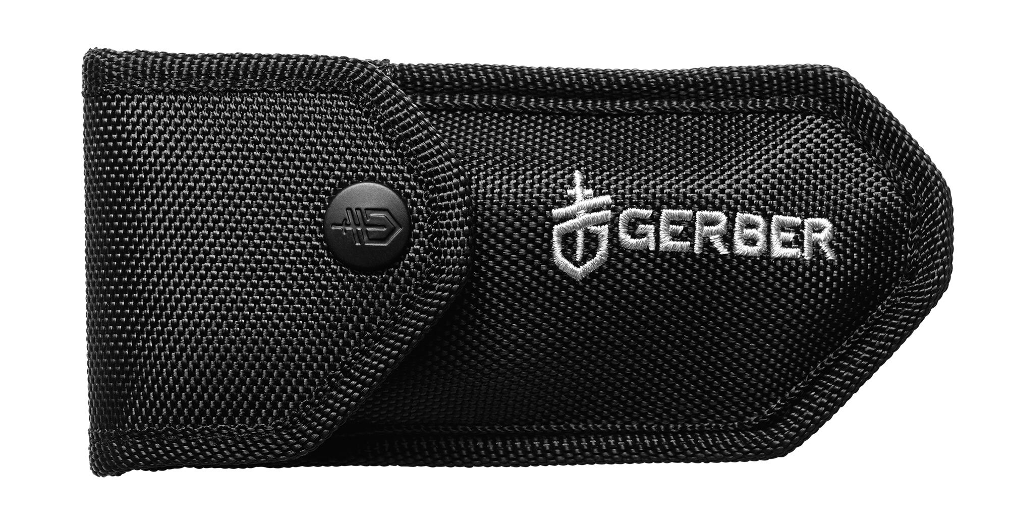 a drop-point blade, a rubberized handle and a nylon sheath.