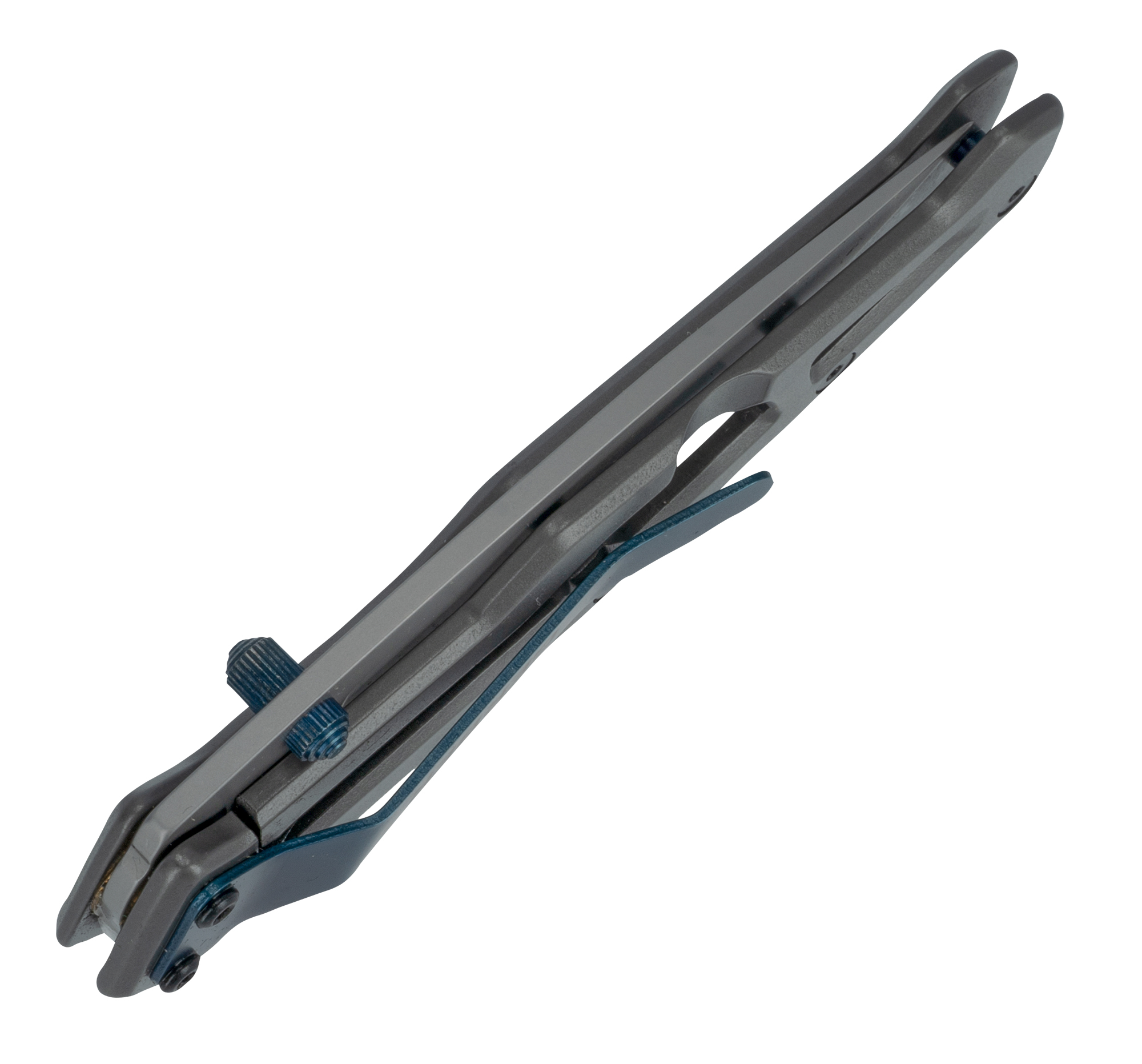 The skeletonized stainless steel frame of the pocket knife ensures a light feel in the hand and pocket.