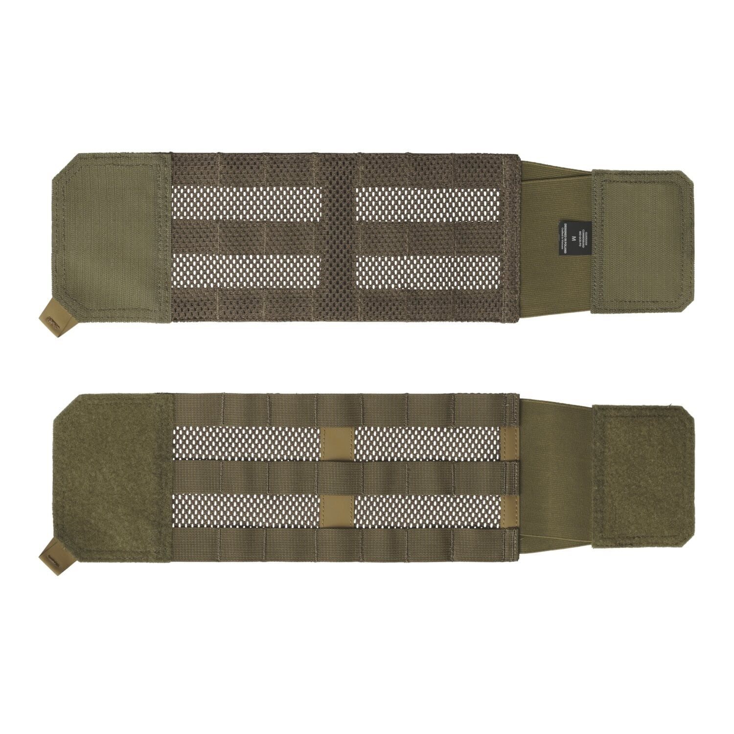 Cummerbund is a set of two side panels that allows you to fasten the front and back parts of the vest. Thanks to the universal design, the product is compatible with other plate carriers available on the market. The cummerbund is made of durable construction mesh ensuring adequate ventilation, even with the equipment installed. A modular system compatible with MOLLE/PALS is sewn on the surface. A skeleton panel made of non-slip Hypalon material is sewn under the straps of the modular system, which not only stabilizes the equipment being carried, but also ensures the appropriate stiffness of the cummerbund itself. The panels are attached to the vest using Velcro. Anti-slip Hypalon handles make it easier to firmly grip the cummerbund when fastening and unfastening it.