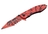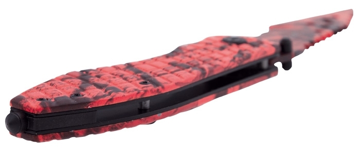 An eye-catching one-hand pocket knife with spring-assisted blade opening. Completely in bright orange-red-camo and also because of its unusual saw grind the knife stands out.