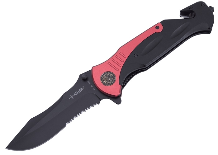 Rescue knife Rescue in XXL format from Haller with belt clip, belt cutter and glass breaker. The spring-assisted 420 stainless steel blade opens in a flash and locks securely in the working position thanks to the liner lock process