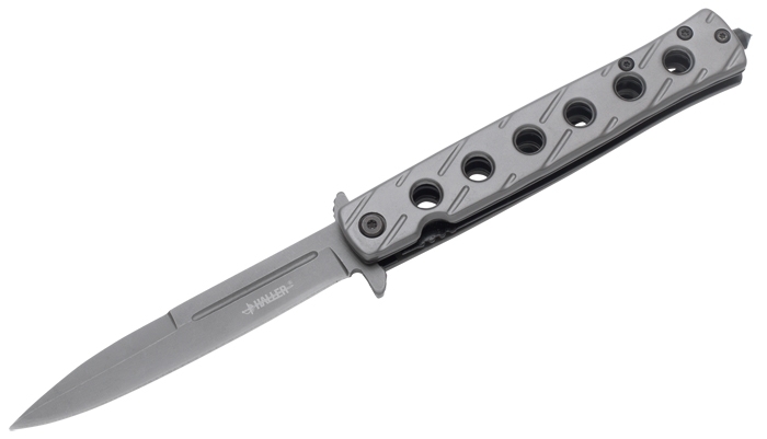 The Haller Stiletto pocket knife with titanium coated 420 stainless steel dagger blade is secured with a liner lock. The blade is ground on one side only. The light alloy handle is also titanium coated and equipped with a glass breaker and belt clip.