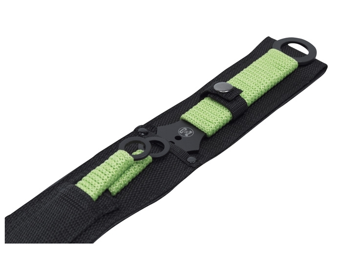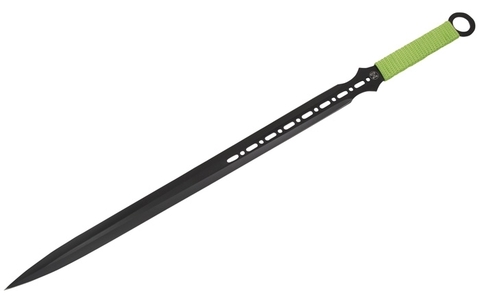 The black coated 420 stainless steel blade goes all the way. As handle sheath zombie green plastic is screwed on, at the end of the handle is a catch strap.