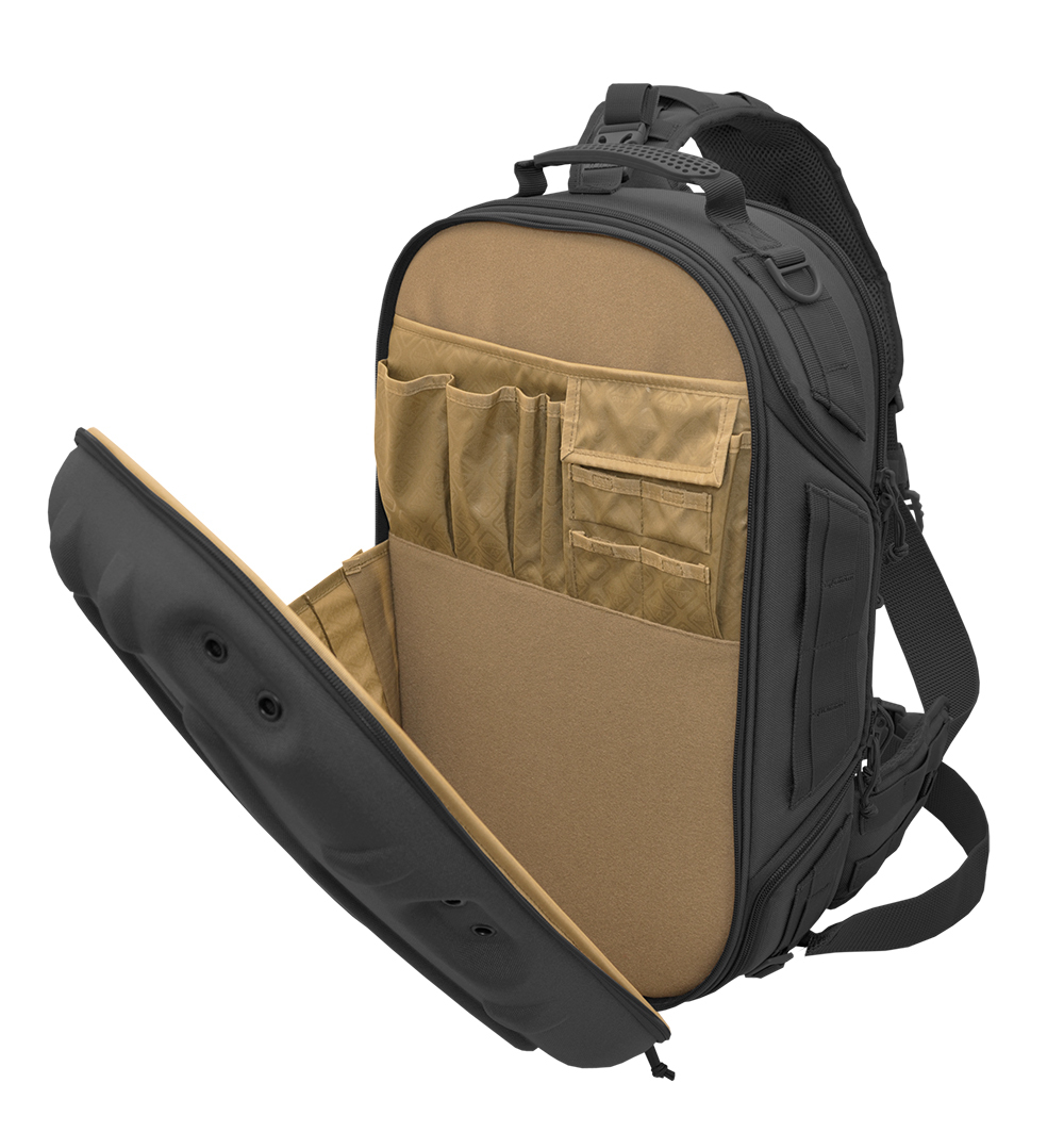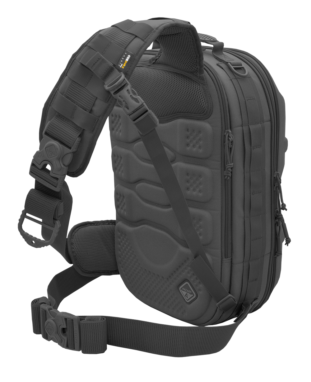 The Hazard 4 Blastwall is a slightly slimmer sling pack version of the popular Hazard4 Pillbox. The lightweight molded shells and 360° padding provide optimal protection for optics, electronics and even weapons. Compartments fit a laptop, tablet, professional camera systems, drones like Mavic Pro, accessories like card readers, and personal items like snacks, rain gear, or first aid kits. The ergonomically designed back padding is abrasion resistant while conforming to the spine and providing optimal ventilation. The top shell has 6 locations for the patented Hazard 4 hardpoint parts, where optional loops, lights, bungee systems, Molle panels, etc. can be attached. This backpack is also great for motorcycle use as it will not flap in the wind. Modular webbing (MOLLE) is provided throughout the sides and straps, and the interior is lined with Velcro panels to allow for expansion with additional pockets