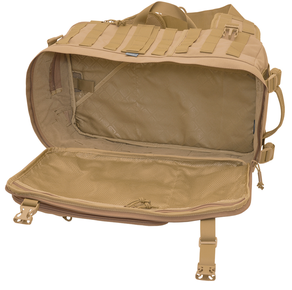 This organizer bag is designed for all common laptops up to a size of 17". The padded back compartment can optionally accommodate a hydration bladder and the laptop in its own case in the spacious main compartment. Due to the additional, adjustable compression straps with quick-release fasteners on the outside of the bag, it can also be used multifunctionally as a daypack