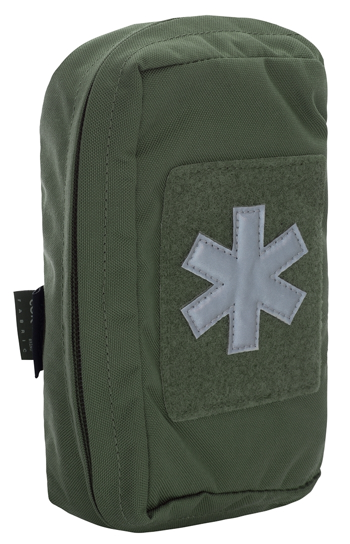 The bag is accessible via a 2-way zipper. Inside is a Velcro plate for attaching the Universal Med Insert®, two elastic loops, two paracord loops and a mesh pocket with elastic drawstring. Additionally, on the front is a fleece Velcro area and a reflective Paramedic Cross. Furthermore, the outer pocket has a removable waist belt, elastic bungee cord with cord stopper and PALS attachment loops.