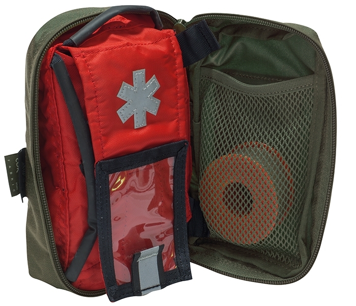 The Universal Med Insert®, opens to the sides and provides immediate access to contents. The segments of the insert can be easily closed and opened with Velcro. When opened, the user has access to the entire first aid kit without having to additionally open or move the components. The insert is red, which together with reflective elements (Paramedic Cross and carrying handle) on the flap helps to find the insert quickly.