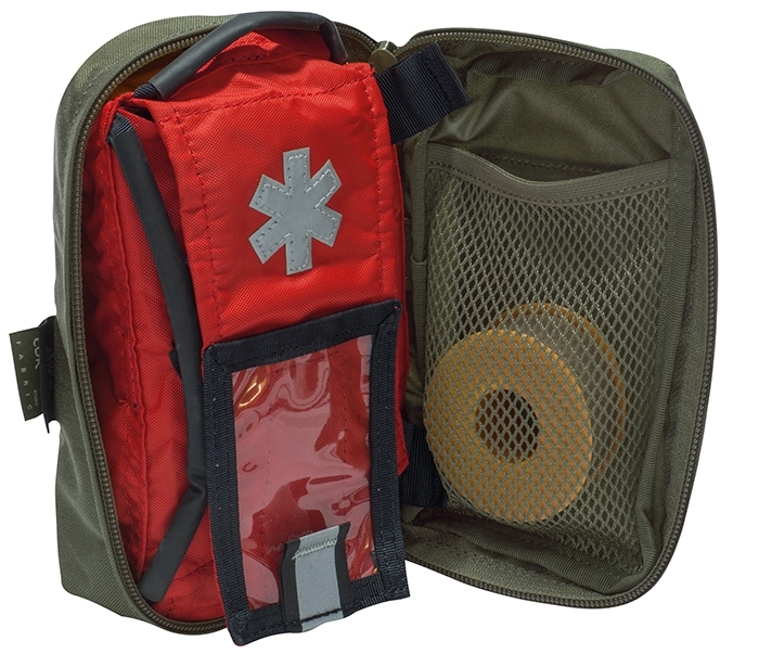 The Universal Med Insert®, opens to the sides and provides immediate access to contents. The segments of the insert can be easily closed and opened with Velcro. When opened, the user has access to the entire first aid kit without having to additionally open or move the components. The insert is red, which together with reflective elements (Paramedic Cross and carrying handle) on the flap helps to find the insert quickly.