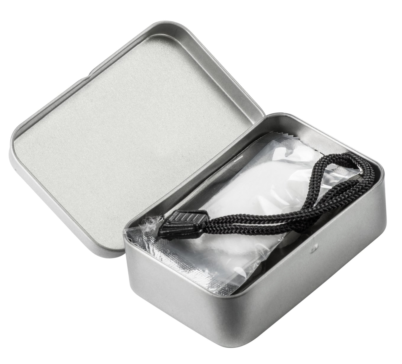 Contents: 1x tin storage can, 1x firestarter with scraper, 2x dry fuel, 2x absorbent cotton.