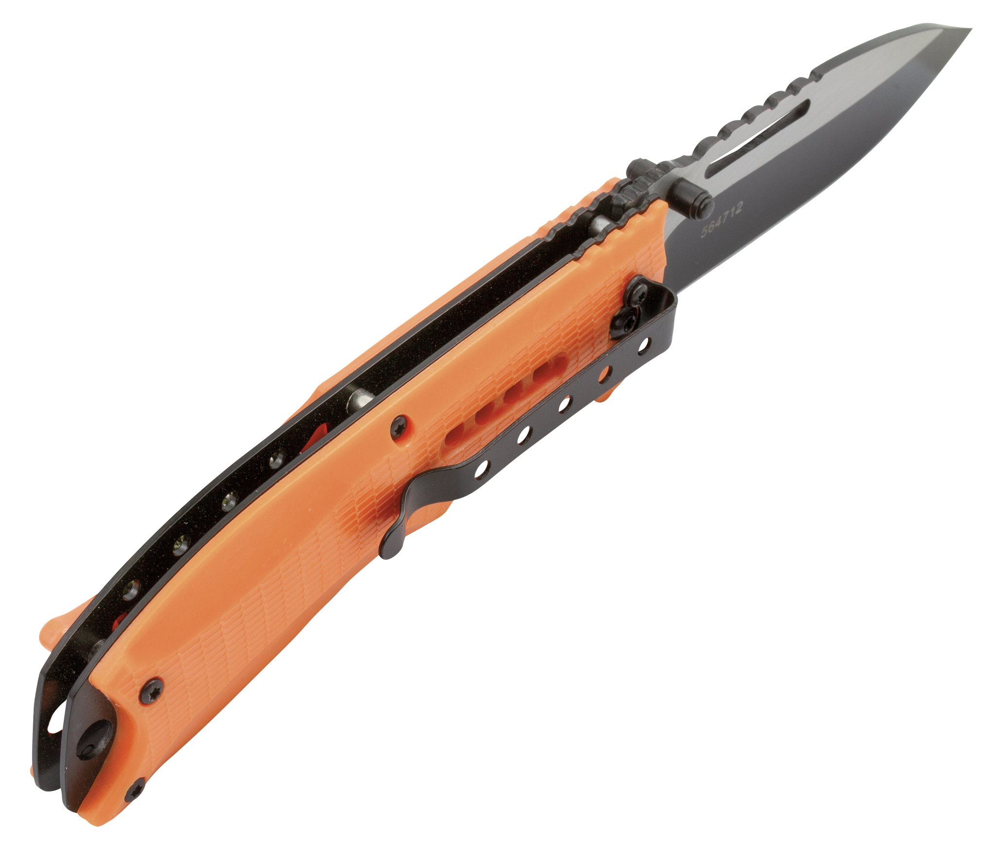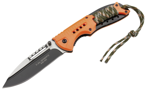 Herbertz offers a model made with numerous color contrasts with this one-handed knife. Thus, a part of the blade made of 420 stainless steel is provided with a protective black coating as well as the belt clip and the partly clearly visible circuit boards. The plastic handle scales in a bright orange, combined with a paracord form a clear color counterpoint to this.