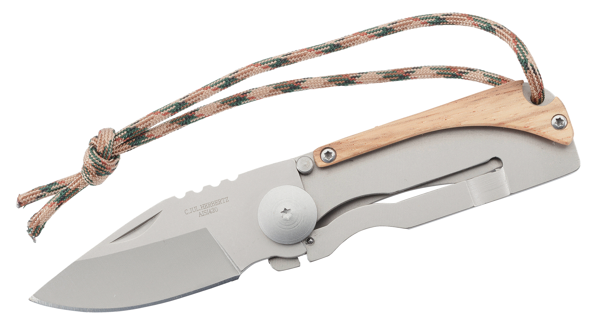 The Herbertz pocket knife 578208 has a 6.5 cm long blade made of stainless steel AISI 420 and handle scales made of zebra wood. The blade is lockable by frame lock blade lock