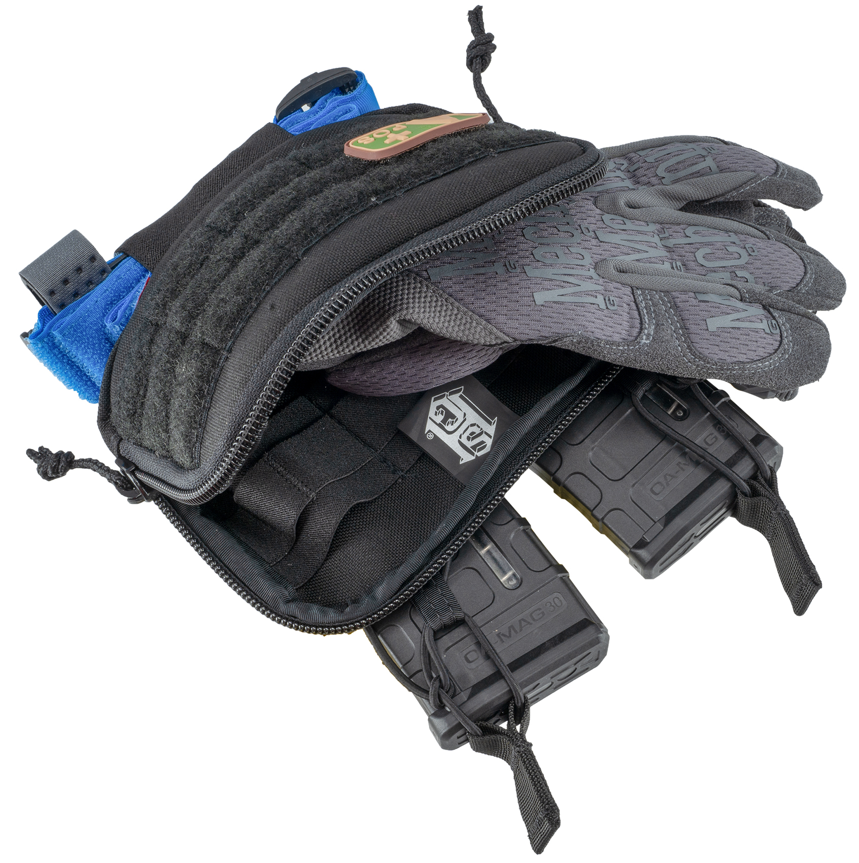 This horizontal admin pouch is a new version of the popular Mini Modular Admin Pouch and is made of 1000D Cordura® laminate. The two rear slots with bungee retaining loops are ideal for two .308 magazines or smaller.