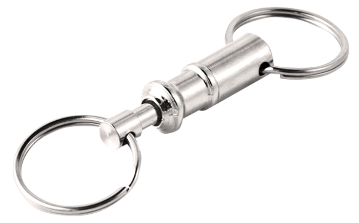 Small and lightweight key holder with two key rings and convenient quick release. To release the key ring, hold the end piece with your index and middle fingers and press the lock with your thumb.