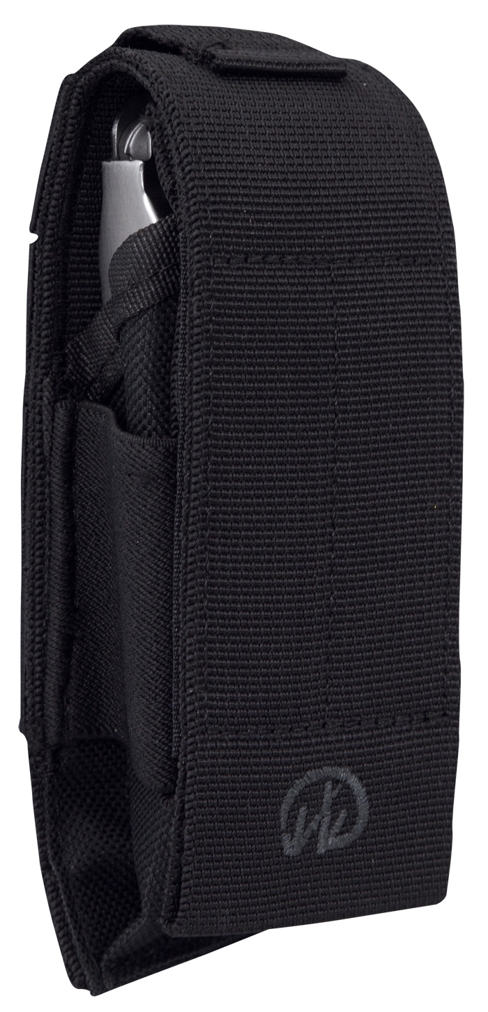 The Leatherman Molle Sheath XL is a holster made of nylon and is attached by a tab with push button located on the back. The additional tab can accommodate the MUT wrench. Features Leatherman logo, Velcro front closure and an inside pocket for bits