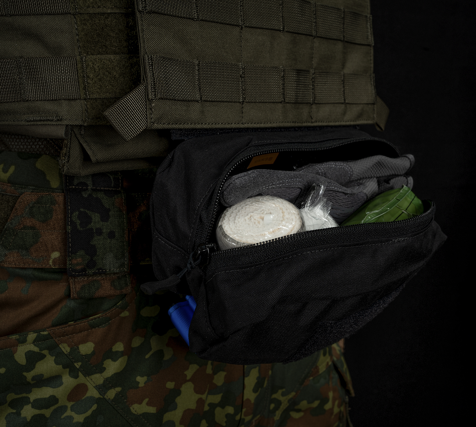 A tourniquet can be attached to the bottom of the bag. You can attach your unit's badge to the front as you wish.