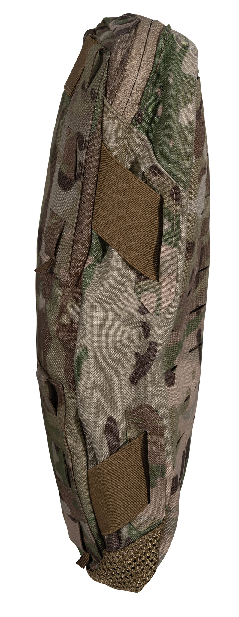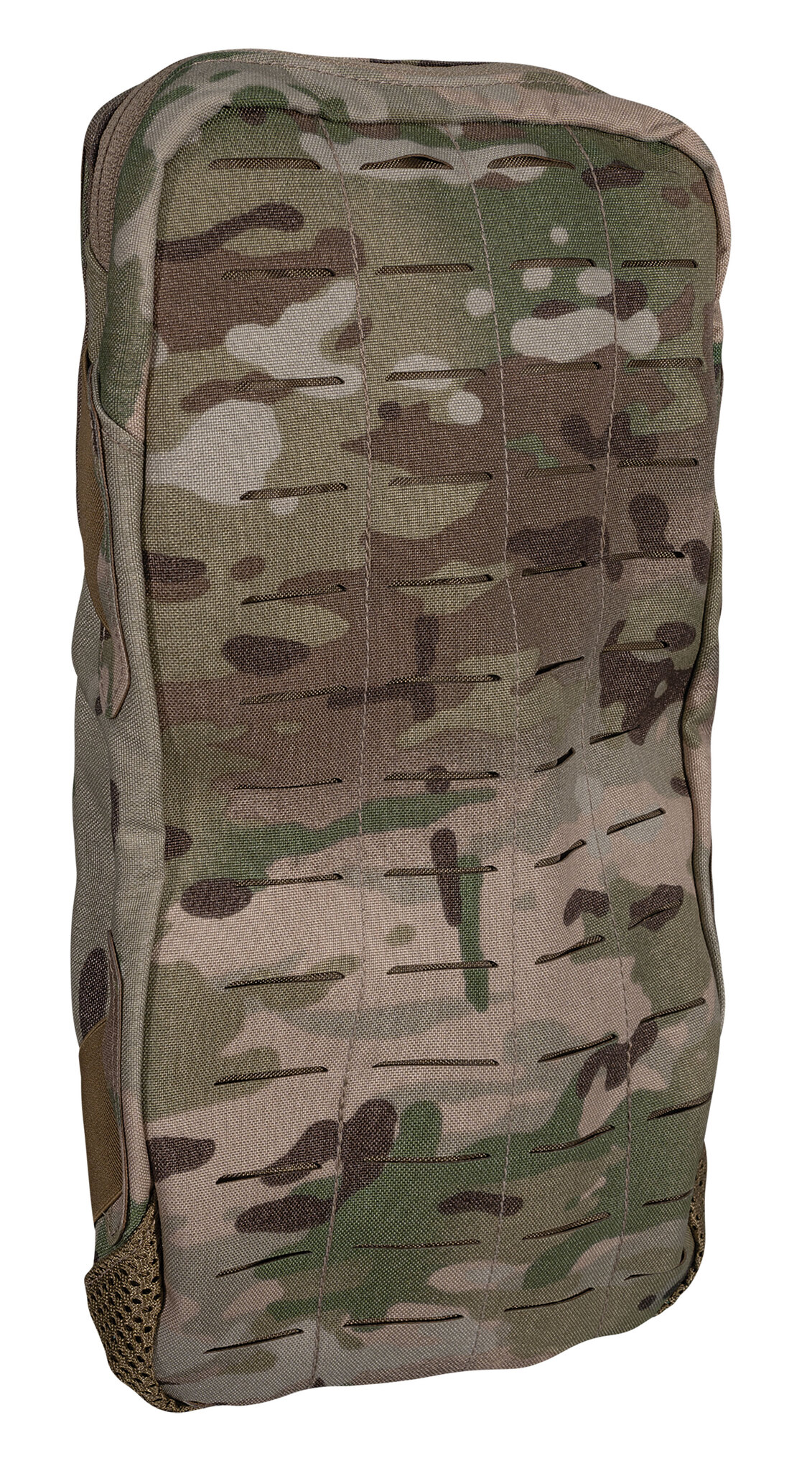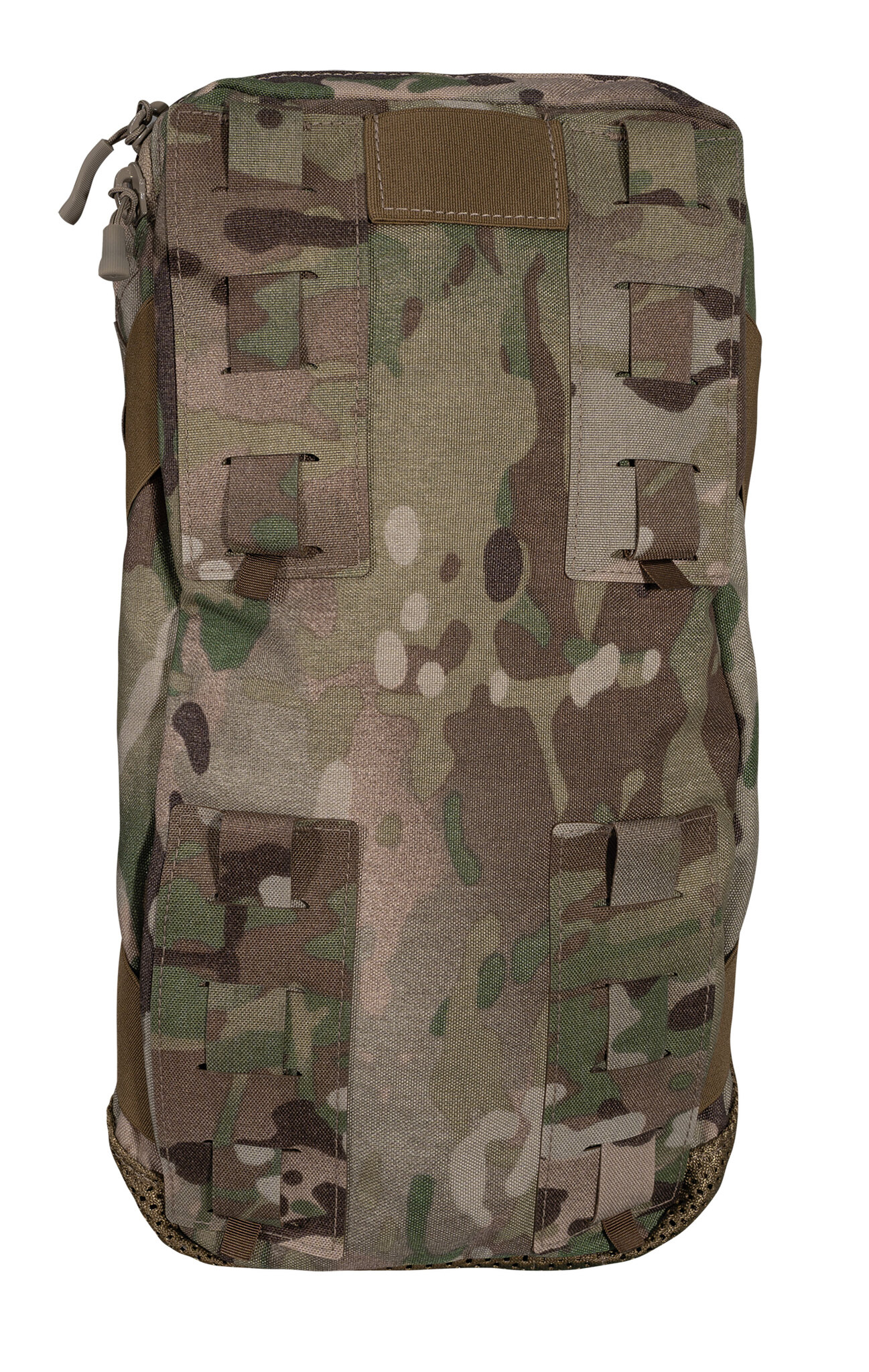 In principle, the water bladder carrier can be combined with 2 liter drinking bladders of all manufacturers. Here, an externally attached rubber webbing serves to fix the bladder and ensures that its contents are evenly distributed. The Lasercut MOLLE loops on the front allow you to attach additional bags and equipment. The bottom of the water bladder bag is made of durable mesh to prevent waterlogging.