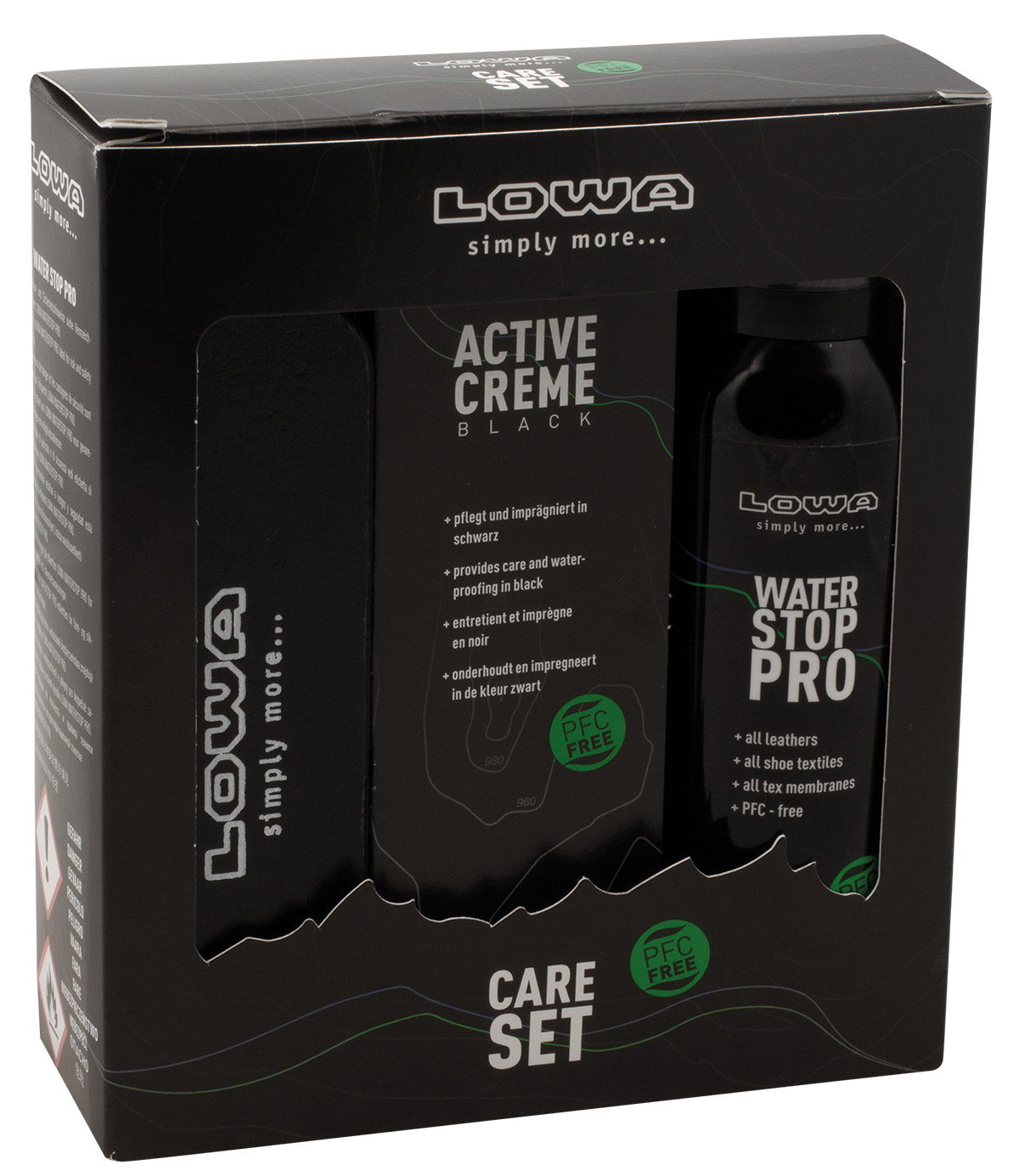 Lowa Care Shoe Care Set Black consisting of a care brush, Active Cream and Water Stop Pro Spray.