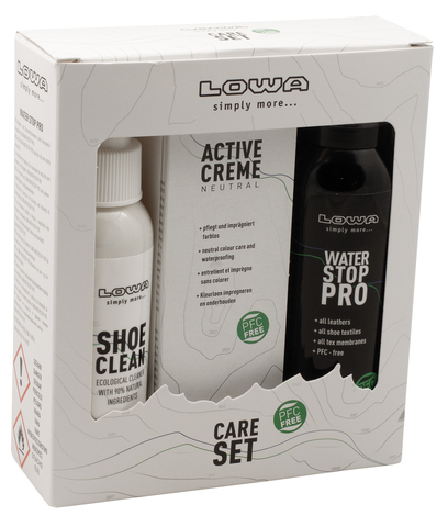 Lowa Care Set Neutral consisting of Shoe Clean Lotion, Active Cream and Water Stop Pro Spray.