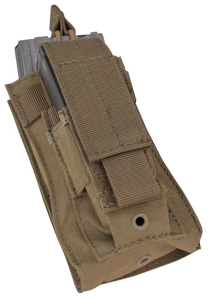Condor Kangaroo Mag Pouch magazine pouch for one M4/ M16 magazine with a rubber pull safety and a 9mm pistol magazine pouch.