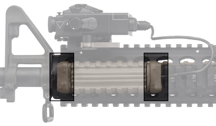 The Manta Switch Holder End Caps simply clip onto the rail and provide a termination for the Pocket Switch Holder. The material of the Manta Switch Holder End Caps is extremely abrasion resistant, heat resistant and chemical resistant, it provides protection from the sharp edges, from heated metal and it reduces the IR signature of the gun.