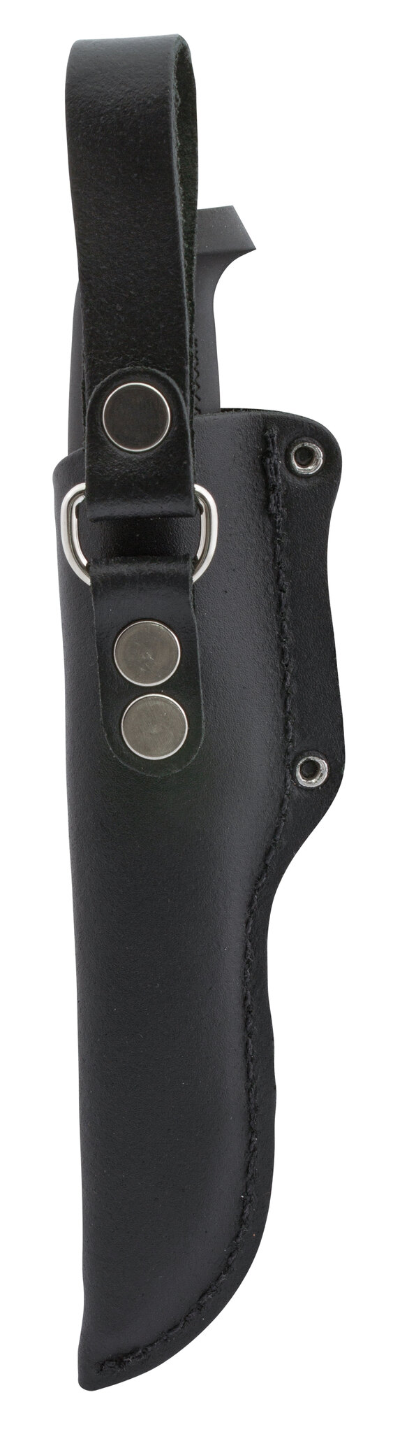 Leather sheath with piercing protection and belt loop for belts up to 4.5 cm wide.