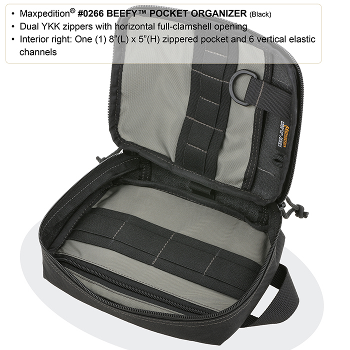 Made of extremely durable 1000 denier nylon, the Maxpedition Beefy Pocket Organizer is a mid-sized multi-purpose bag from the Maxpedition Packet Organizer series. It features two interior compartments and multiple elastic attachment loops.