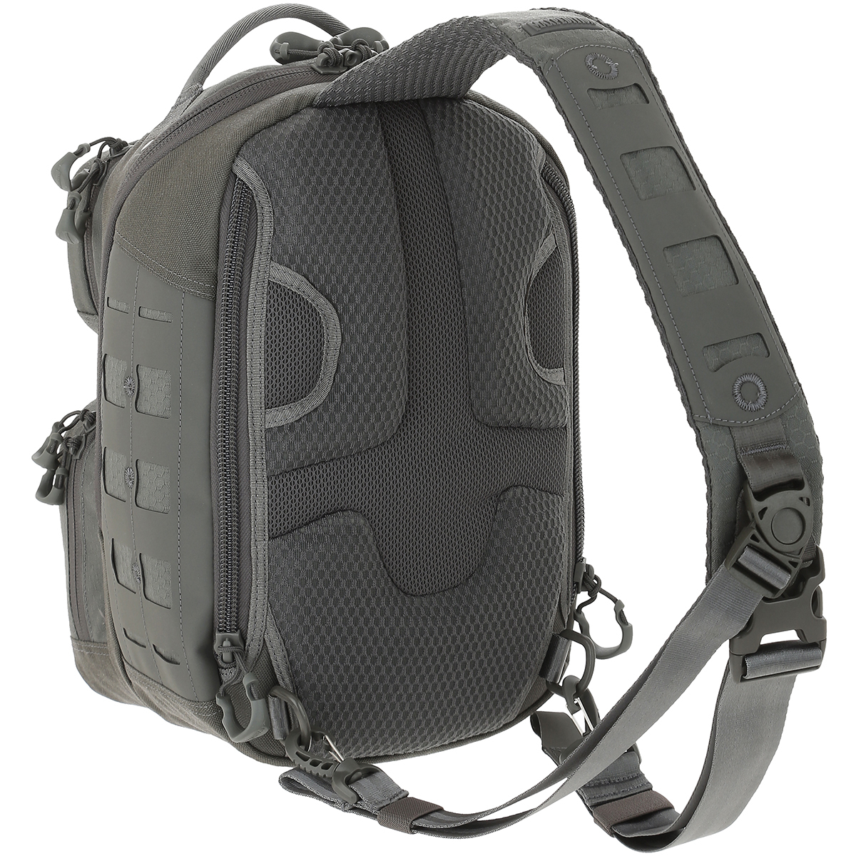 MOLLE compatible laser cut TPU-840D nylon composite panels on front, sides and shoulder strap.