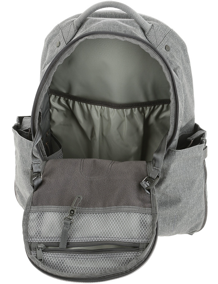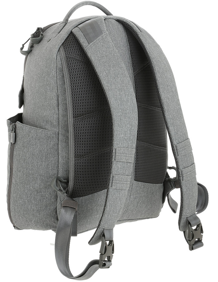 The Maxpedition Entity 19 from the Entity series is a backpack with padded shoulder straps and quick release buckles. The main compartment has various zippered mesh and slide-in pockets. The main compartment has stowable magnetic wings for quick temporary closure. Dual access CCW back compartment is fully equipped with fleece velcro.