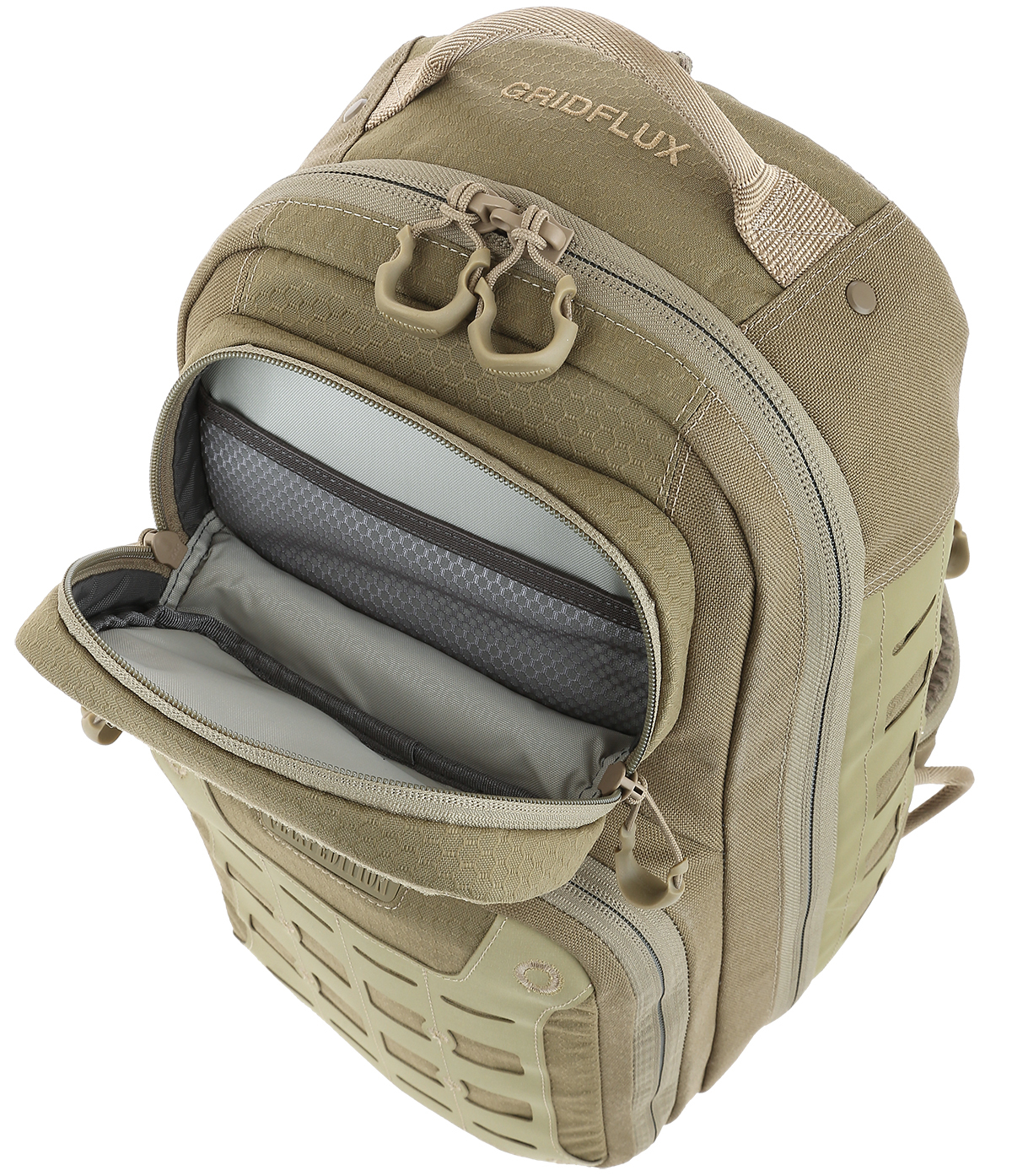 The Maxpedition Gridflux from the Advanced Gear Research series is an 18 liter sling pack with a reinforced padded shoulder strap. The Gridflux has two CCW compartments - The first CCW compartment is located in the main compartment of the pack. It is a fully lined zippered pocket that can also be used for tablets. The second CCW compartment is located on the back of the backpack. You can quickly access it by loosening the chest strap and swinging the pack to the front of your body. A fleece-lined hard case is located on the front of the pack for storing fragile items like sunglasses or a small camera. On the outside, the sling pack features AT.tachment LA.ttice System (ATLAS), a MOLLE-compatible Laser Cut TPU-840D nylon composite carrier for modular accessory addition. The Gridflux is made of abrasion-resistant 500 denier hex ripstop and 1000 denier nylon, which is triple PU coated on the inside and Teflon coated on the outside. The exterior YKK zippers are equipped with convenient and easy-to-grip YKK ring pullers.