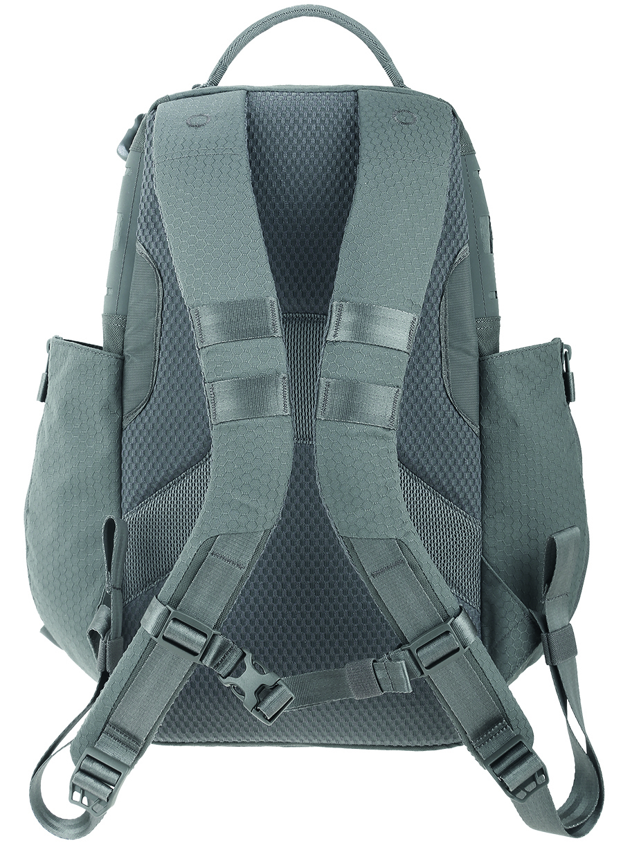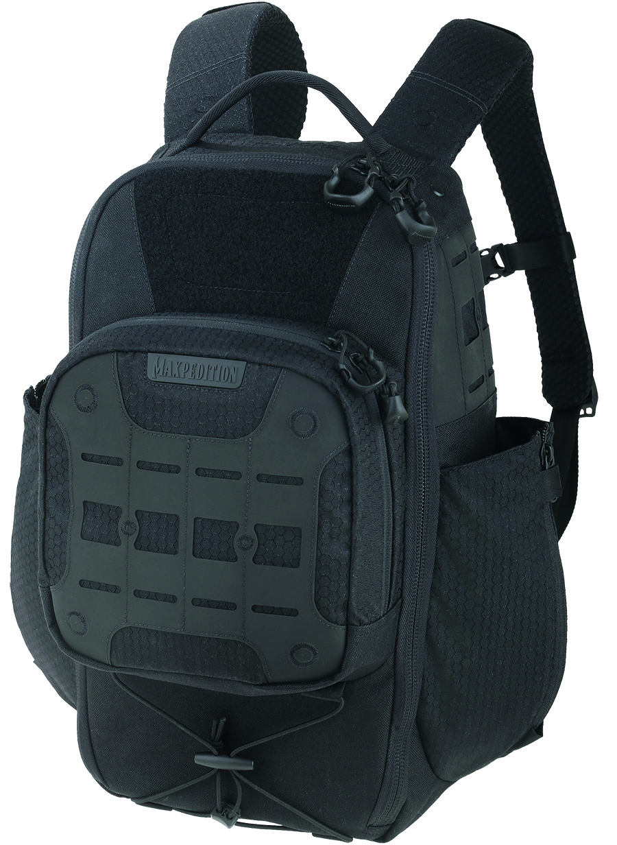 MOLLE compatible laser cut TPU-840D nylon composite panels on front and sides.