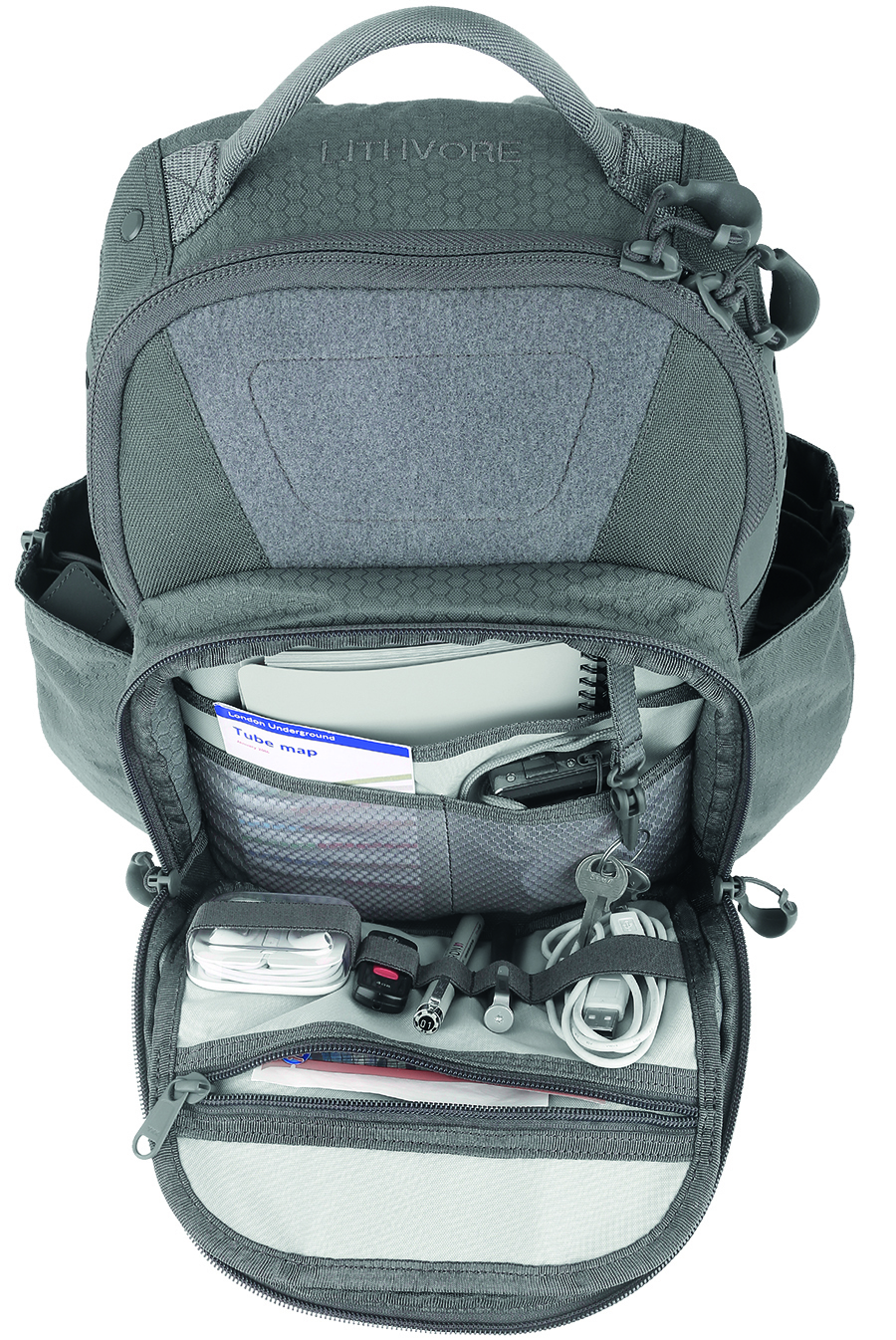 The Maxpedition Lithvore from the Advanced Gear Research series is a small, compact EDC (Everyday Carry) backpack with 17 liters volume. It features ergonomically designed shoulder straps and an Airmesh padded back pad. It has a fully opening main compartment, an admin front compartment and two expandable bottle pockets on the sides. On the outside, the pack features AT.tachment LA.ttice System (ATLAS), a MOLLE-compatible Laser Cut TPU-840D nylon composite carrier for modular accessory addition. The Lithvore is made of abrasion-resistant 500 denier hex ripstop and 1000 denier nylon, which is triple PU coated on the inside and Teflon coated on the outside. The exterior YKK zippers are equipped with convenient and easy-to-grip YKK ring pullers.
