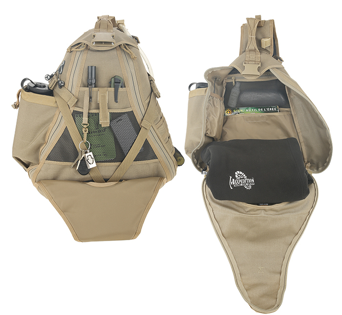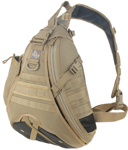 The original Maxpedition Monsoon Gearslinger is worn over the right shoulder and sits on the left hip. It features a rugged teardrop-shaped design that has a roomy main compartment, flat back pocket, fixed shoulder strap, internal MP3 player pocket with rubberized headphone pass-through and a protective waterproof flap. Two pockets hold a 3 liter hydration reservoir and a 1 liter water bottle. Two cross-over compression straps reliably secure the contents. The narrow hip belt can be stored in a small pocket when not in use. The Gearslinger is made entirely of water- and abrasion-resistant 1000 denier nylon, which is triple PU coated on the inside and Teflon coated on the outside