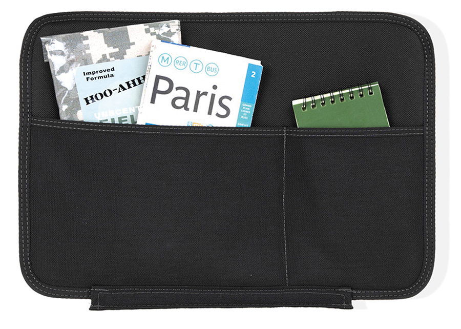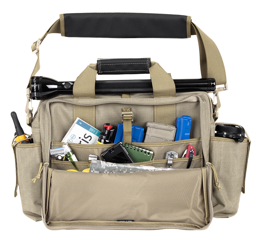 On the opposite side is a fully padded organizer with extensive internal compartments that open to hold documents and/ or tools. Both sides of the insert bag are equipped with cinch pockets for 32oz Nalgene water bottles or radios, there is a radio pocket and a water bottle pocket. Webbing loops provide storage for a flashlight or baton. The duty bag is made entirely of water- and abrasion-resistant 1000 denier nylon, which is triple PU coated on the inside and Teflon coated on the outside.