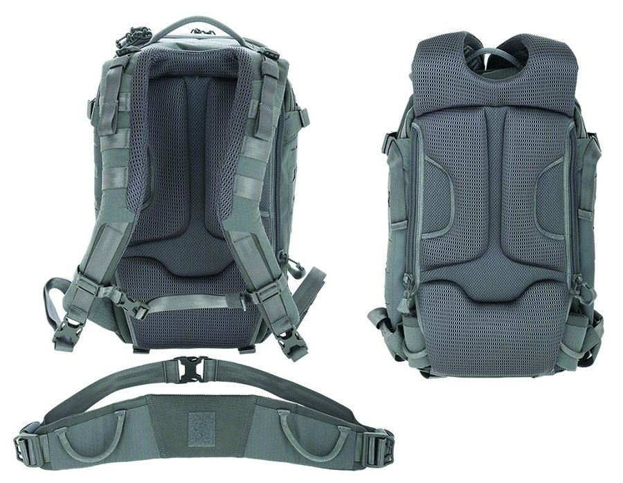 MOLLE compatible laser cut TPU-840D nylon composite panels on front and sides.