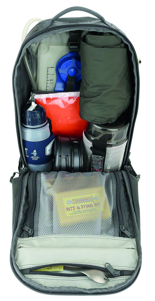 Main compartment with lockable 2-way zipper, hydration bladder holder, 1 zippered mesh pocket and 1 zippered compartment.