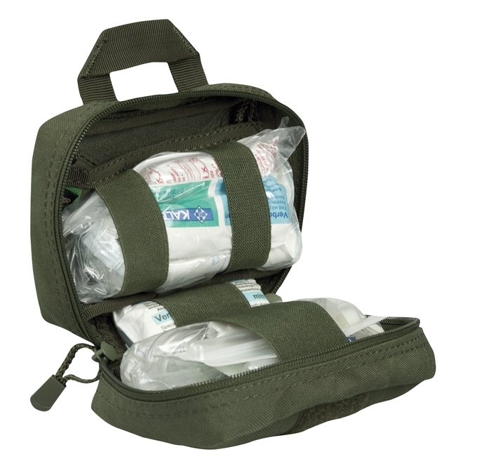 First aid bag is attached to a Molle plate with Velcro and fleece and is secured with webbing with Fastex buckle. In emergency situations, the bag can be quickly pulled from the plate. Zippered opening, internal compartment and elastic straps.