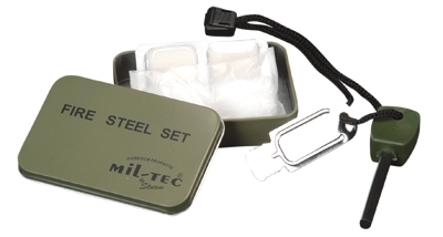 The Mil-Tec Fire Steel Set consists of flint Small with scraper and cord, two fuel tablets, absorbent cotton and storage box. Simply brush the steel along the magnesium rod and sparks will fly. Works in any weather, at any altitude.