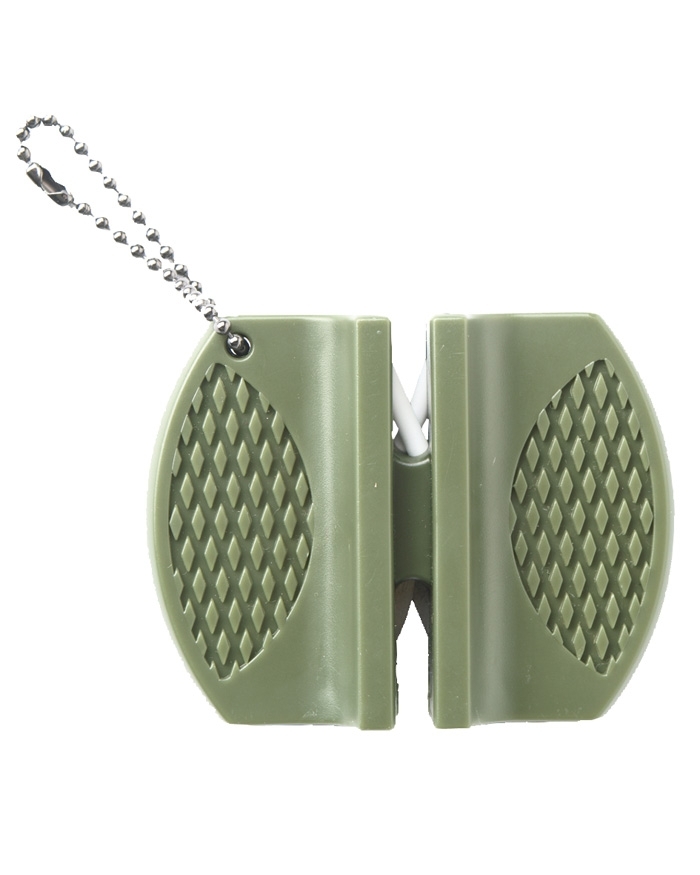 Mil-Tec knife sharpener with 2 different sharpening systems for coarse (carbide) and fine (ceramic) grinding in a V-shaped arrangement. On the bottom and top of the plastic housing are rubber pads for safe handling during sharpening