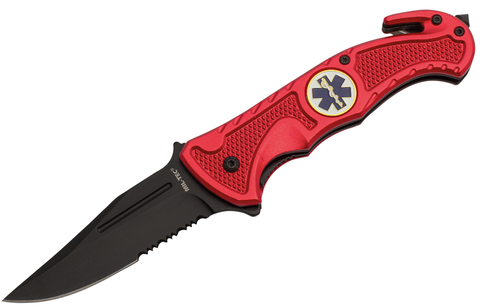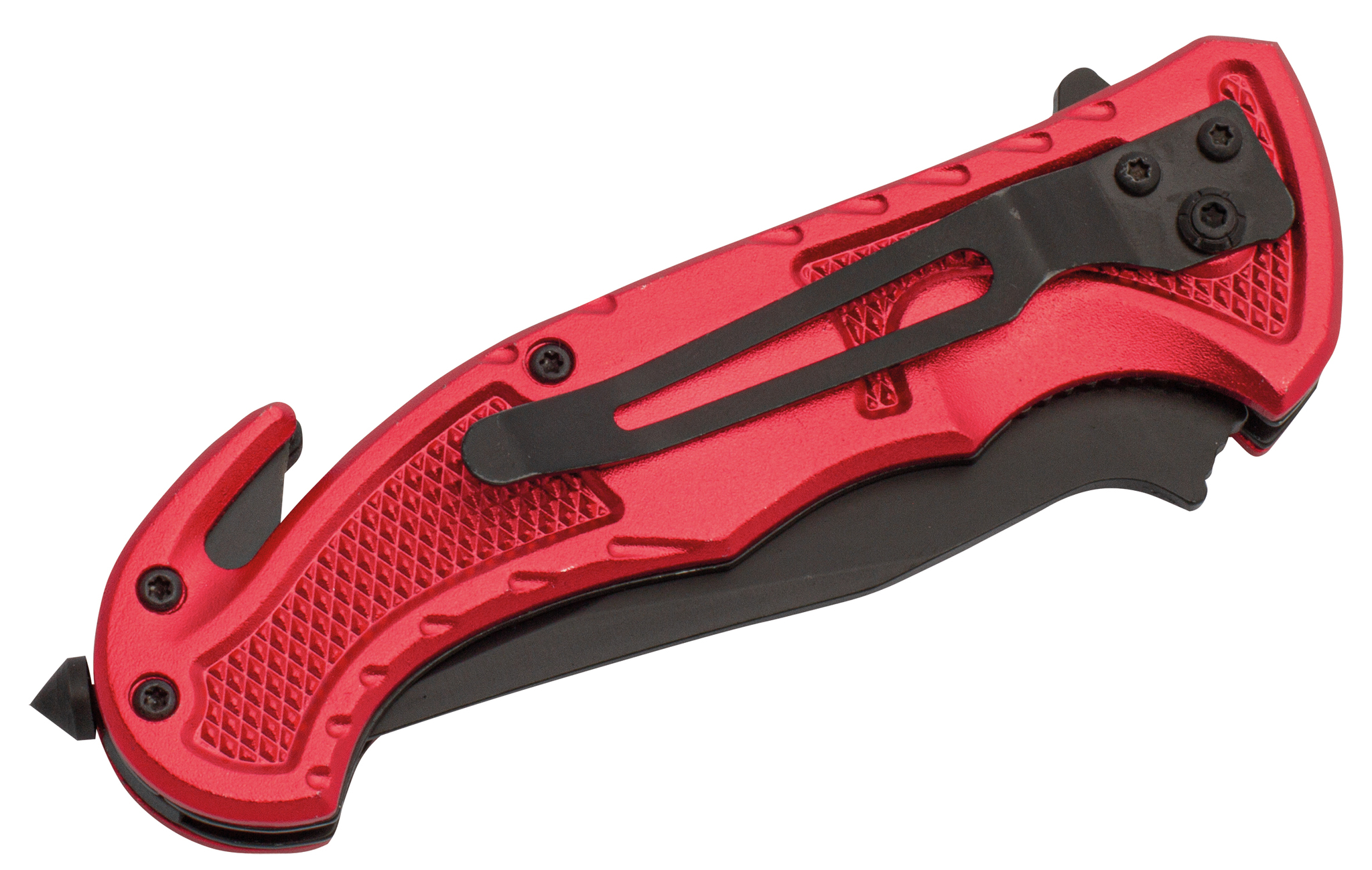 Rescue knife with partial serrated edge, belt snapper and glass breaker.
