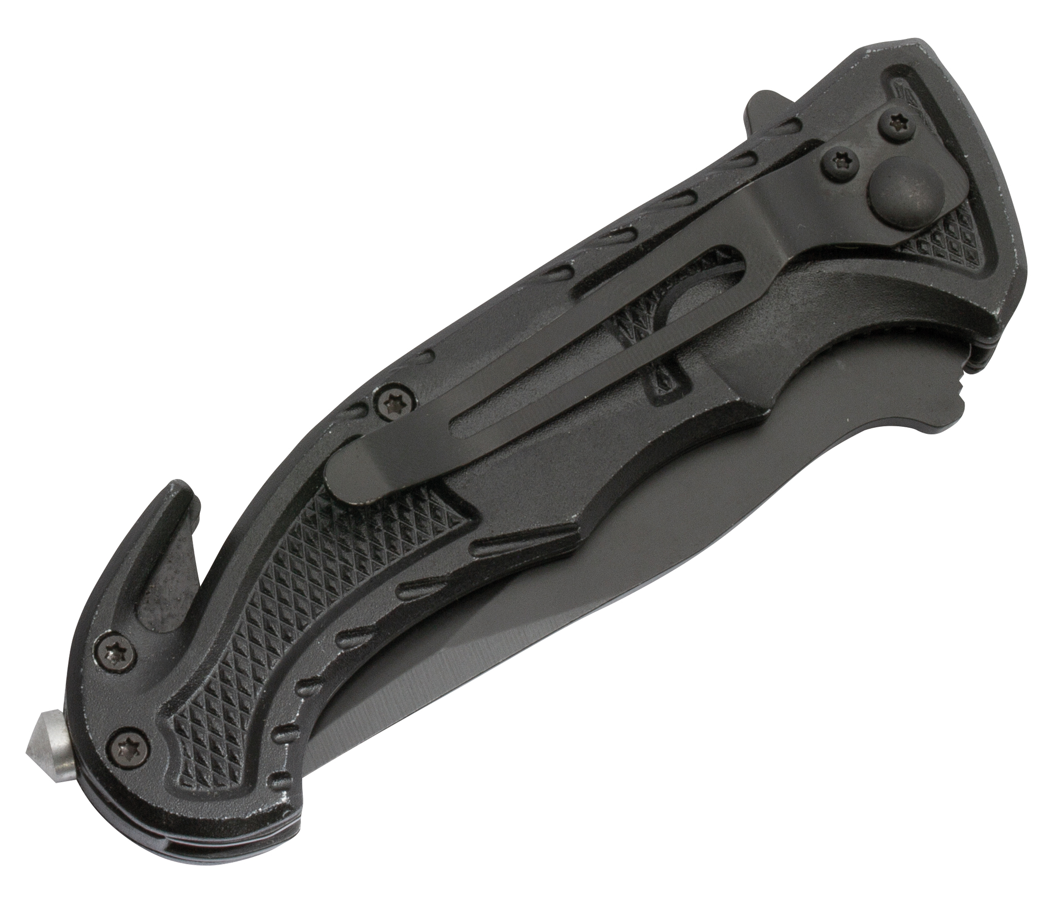 Rescue knife with partial serrated edge, belt snapper and glass breaker.