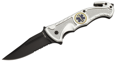 Rescue knife with partial serrated edge, belt snapper and glass breaker.
