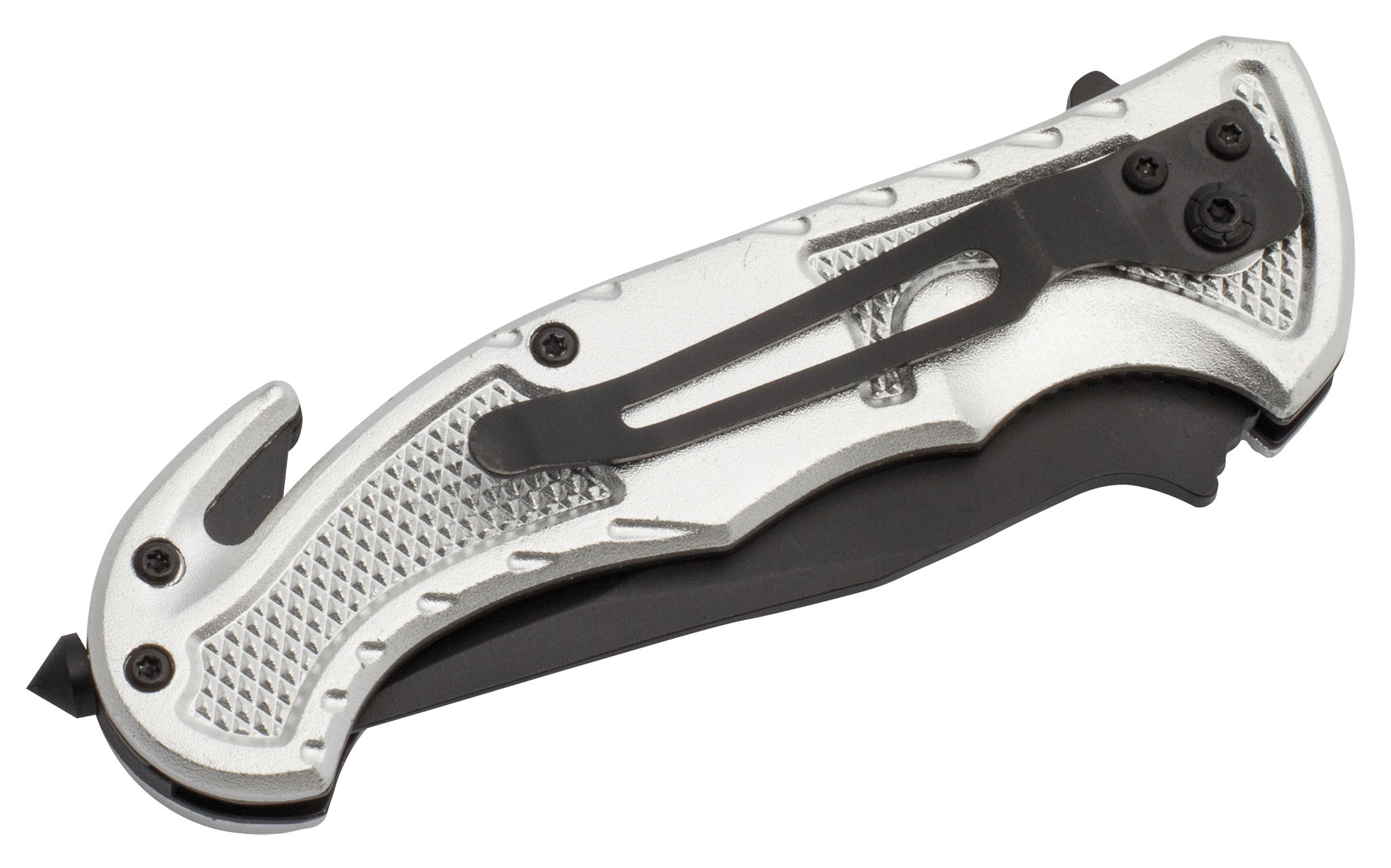 A practical rescue pocket knife with black coated blade made of 420 stainless steel which also offers a partial serrated edge. Thanks to spring support, the blade can be opened in a flash with the help of the flipper and is locked securely by the liner lock. In the aluminum handle is a belt cutter inserted at the end of the handle is a glass breaker and on the back a practical belt clip.