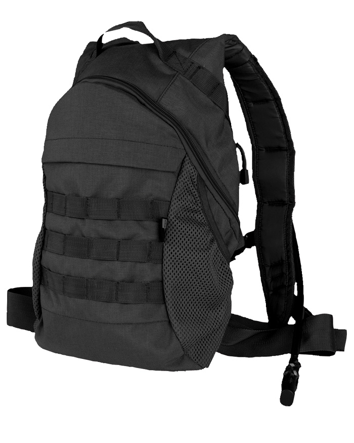 Hydration backpack with adjustable straps, chest strap, waist strap and padded pure nylon back. Zippered main compartment for accessories, small zippered compartment and side mesh pockets. Molle loops allow further attachment of gear.