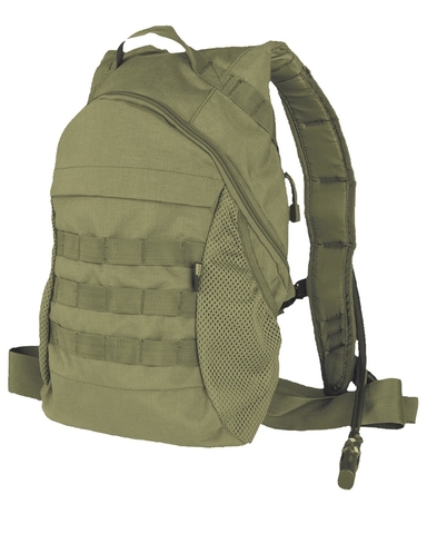Hydration backpack with adjustable straps, chest strap, waist strap and padded pure nylon back. Zippered main compartment for accessories, small zippered compartment and side mesh pockets. Molle loops allow further attachment of gear.