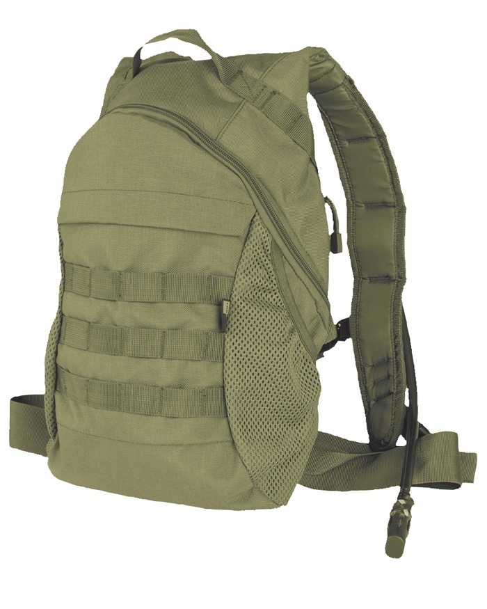 Hydration backpack with adjustable straps, chest strap, waist strap and padded pure nylon back. Zippered main compartment for accessories, small zippered compartment and side mesh pockets. Molle loops allow further attachment of equipment.